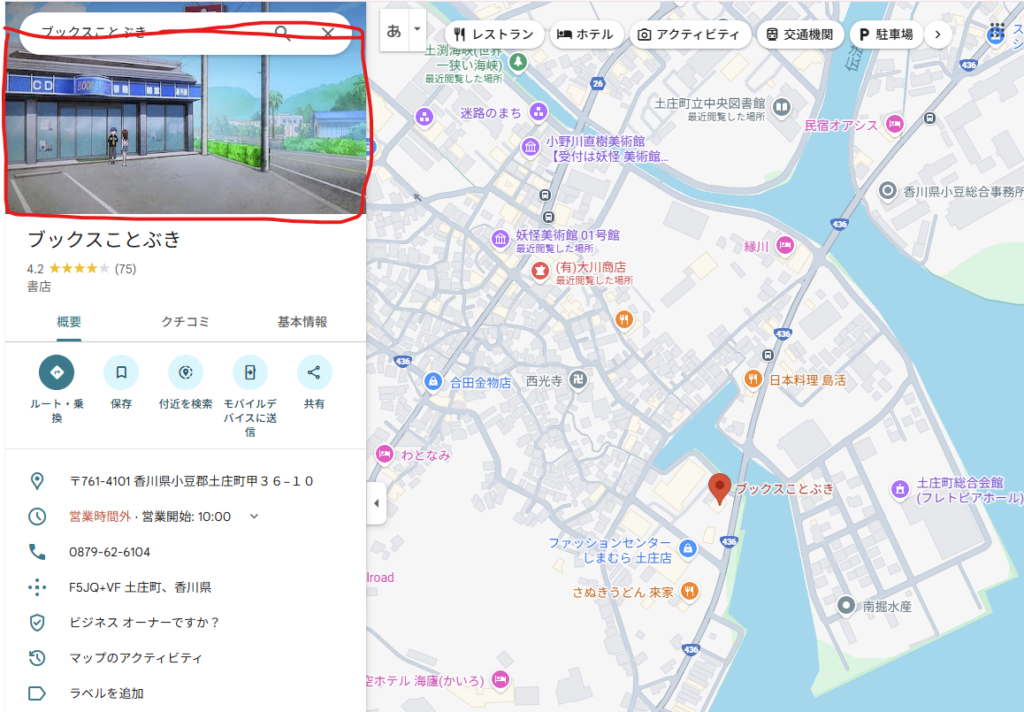 面白いのがgoogleマップで調べると、ストリートビューの写真ではなくアニメの写真になっていることです。(聖地だとわかりやすい!)