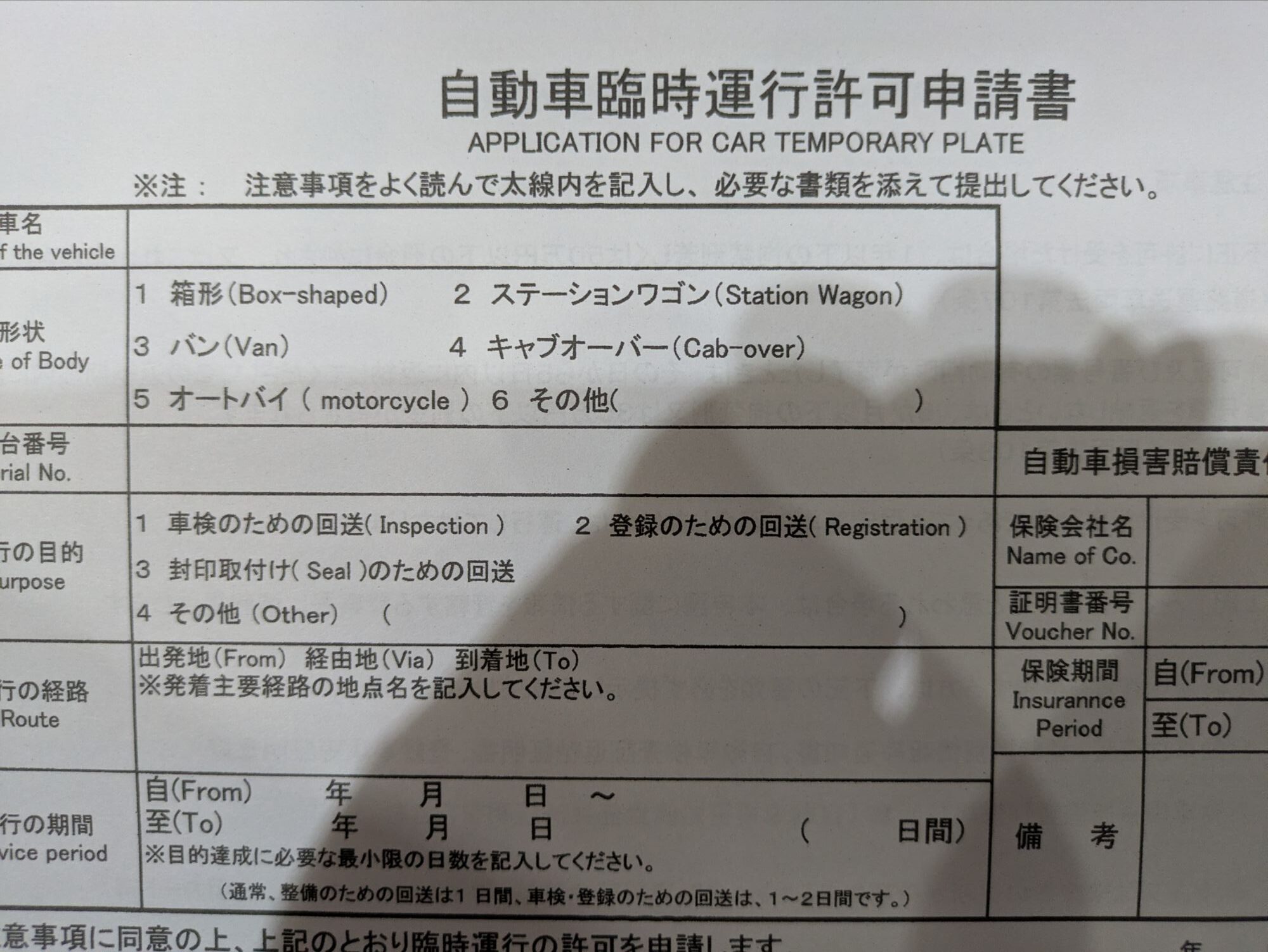 自動車臨時運行許可申請書