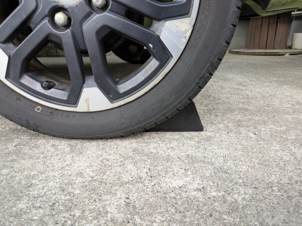 スロープとタイヤを密着させた状態で置いておき、ドライブに入れて車を前進させます。