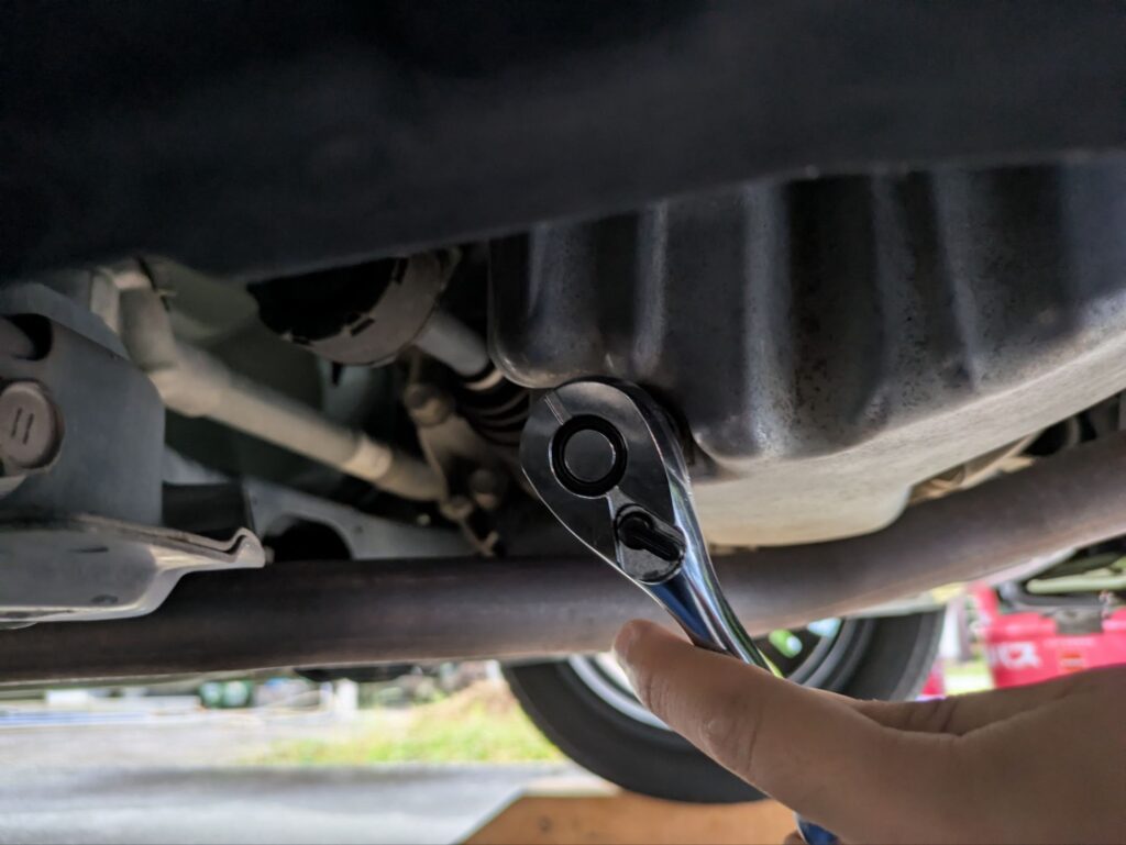 最初だけラチェットで緩めると、後は手で徐々に緩めればオイルが出てきます。