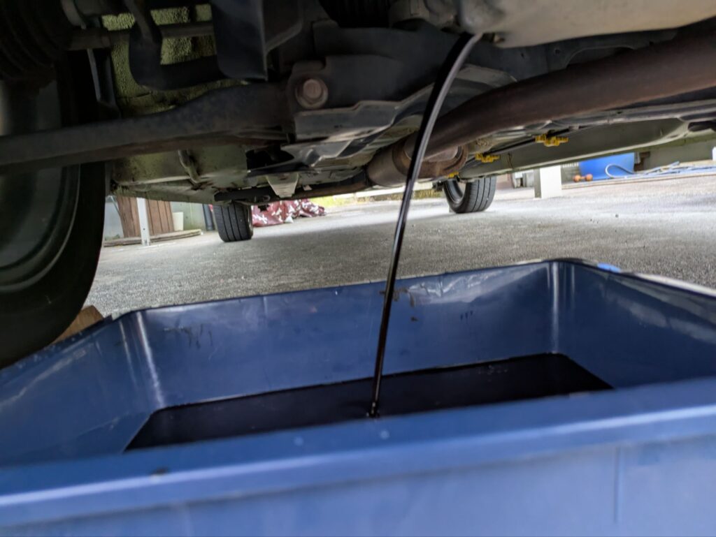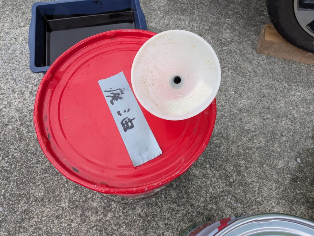 オイル交換時に出た廃油を処分します。我が家では空のペール缶に廃油を集めておき、集まったらなじみのガソリンスタンドに引き取ってもらいます。