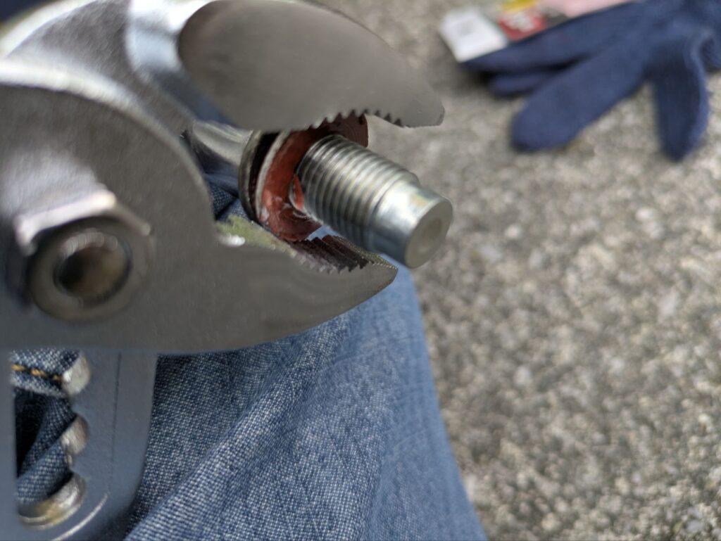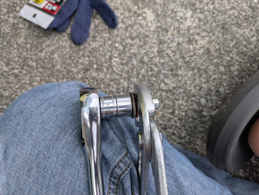 プライヤーでドレンワッシャー側をつかんでおき、ボルトをラチェットで回すと