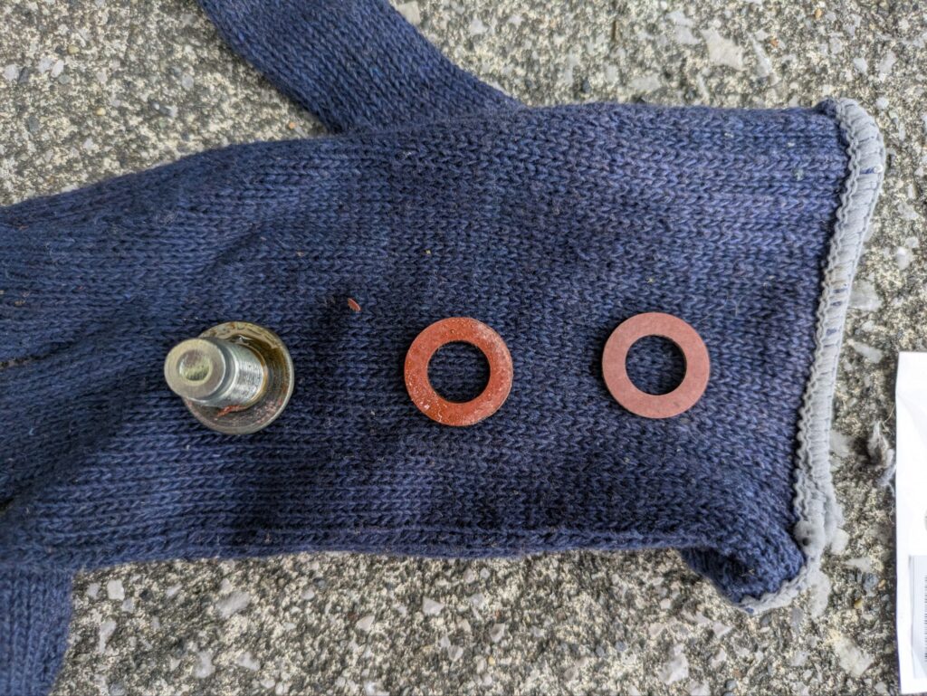 写真には何種類かありますが、今回は写真に映っていないカストロールのオイルを交換します。 - ドレンボルトワッシャ