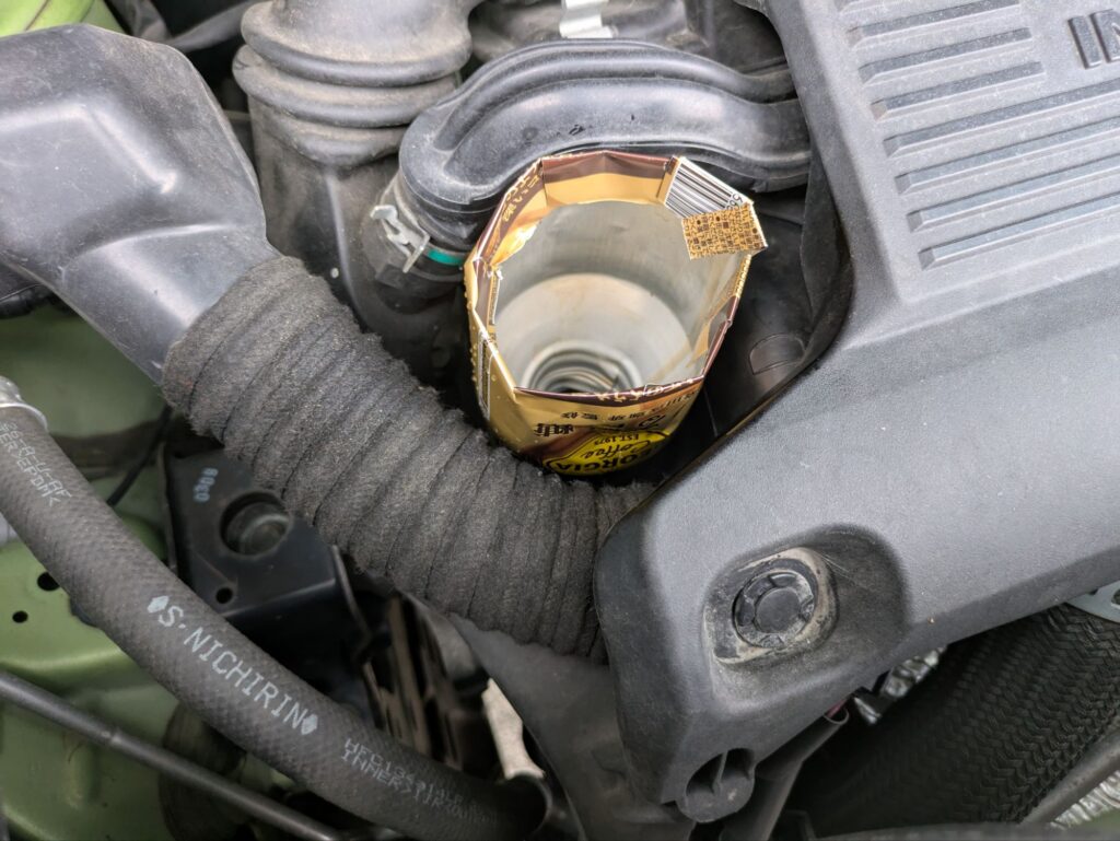 新品のオイルを注ぎます。ウェイクのエンジンオイルは奥まった場所にあるので、写真のように空き缶で漏斗を作って注げるようにしました。