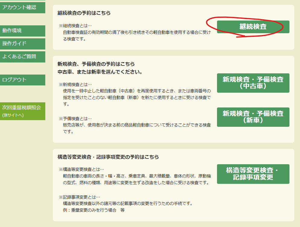 既にナンバーがあり継続して車両を乗りたい場合は継続検査をクリックします。