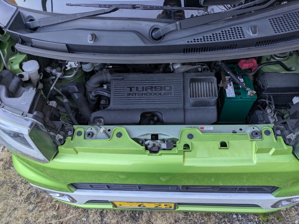 ボンネットを開くと中央にエンジンがあり、左側にウィンドウォッシャー液を入れる場所があります。写真左側の白いフタですが、ウィンドウォッシャーのマークがついているのでわかると思います。