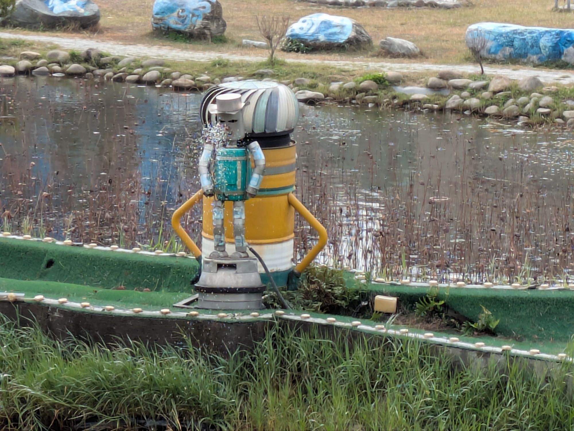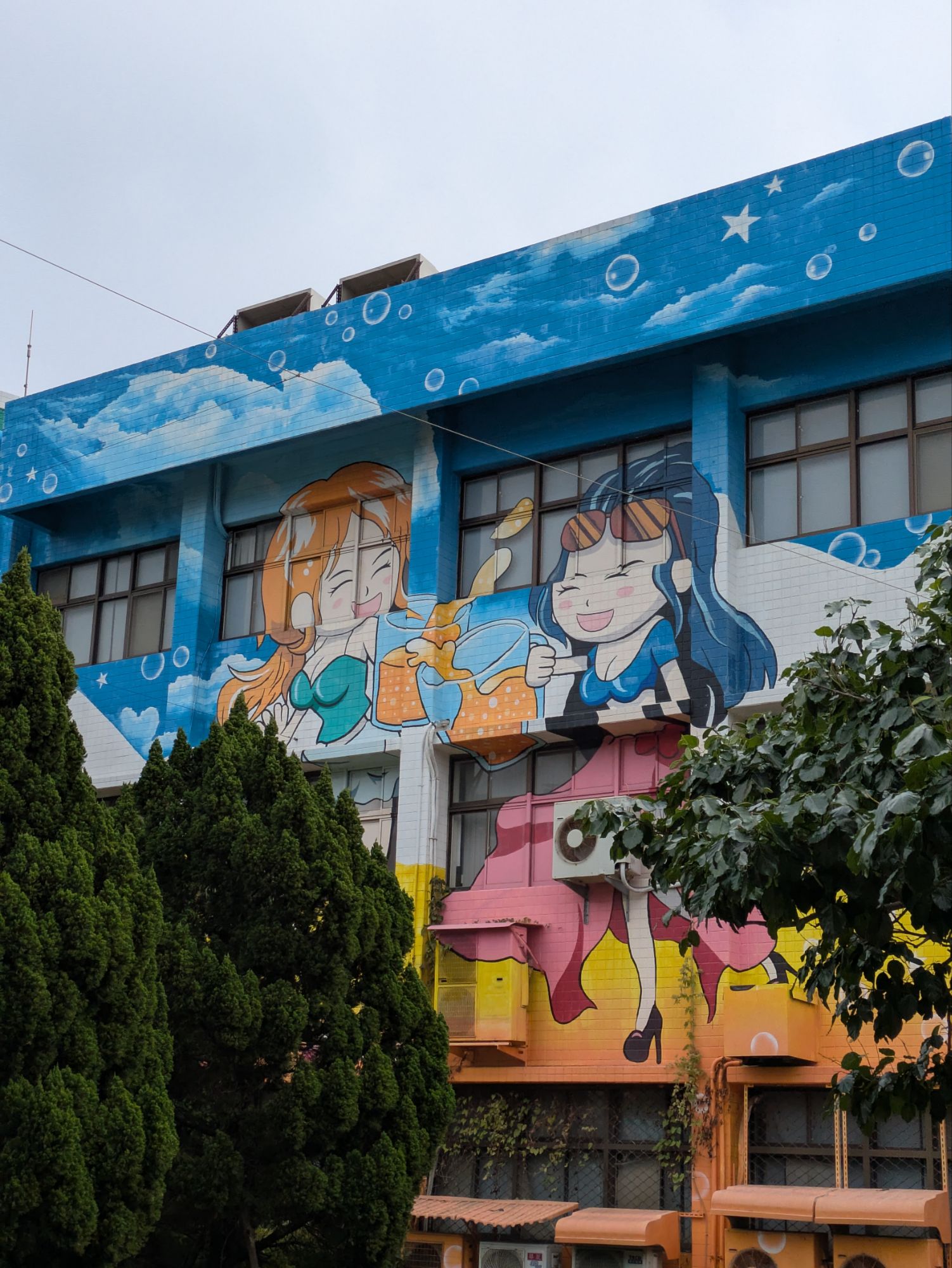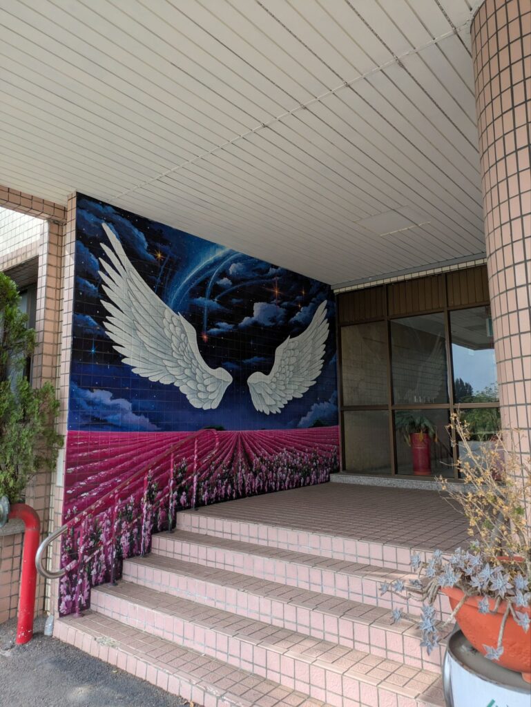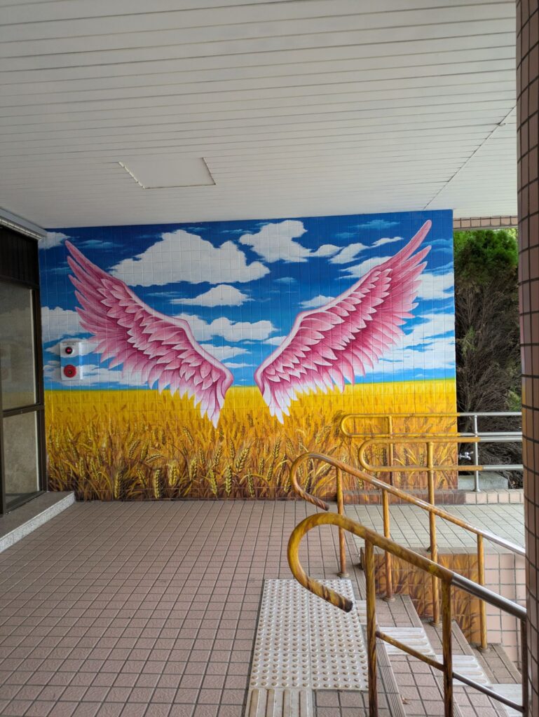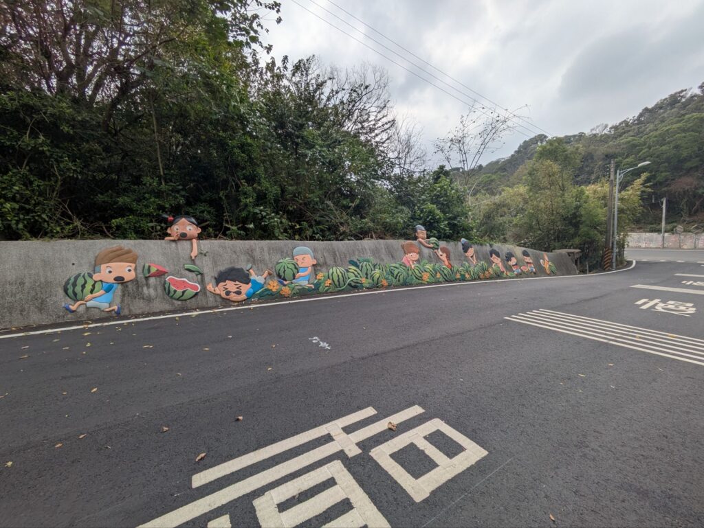 自転車を借りに行く途中の道ものどかな風景が広がります。途中の壁にはスイカが描かれております、スイカの産地だということがわかります。